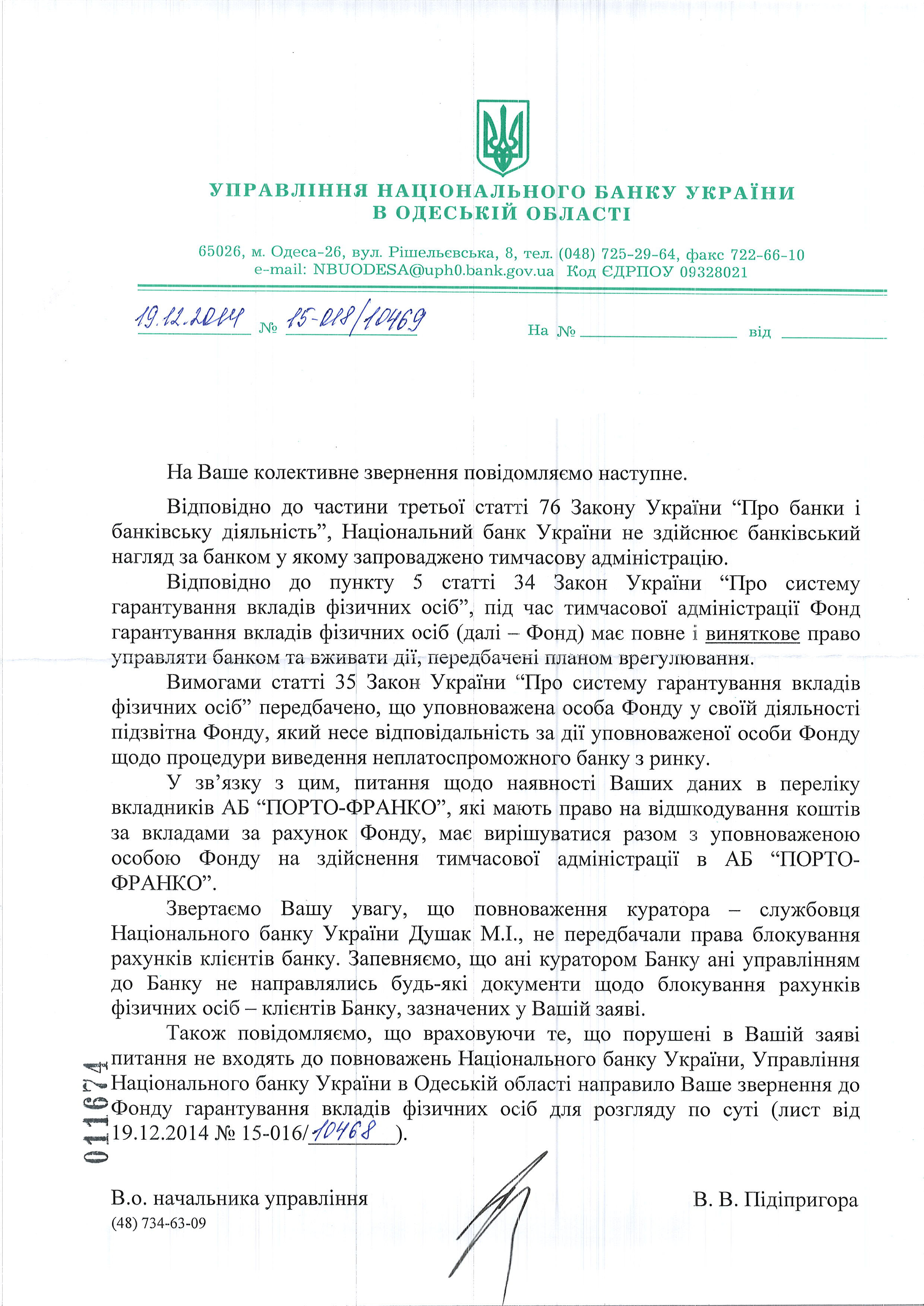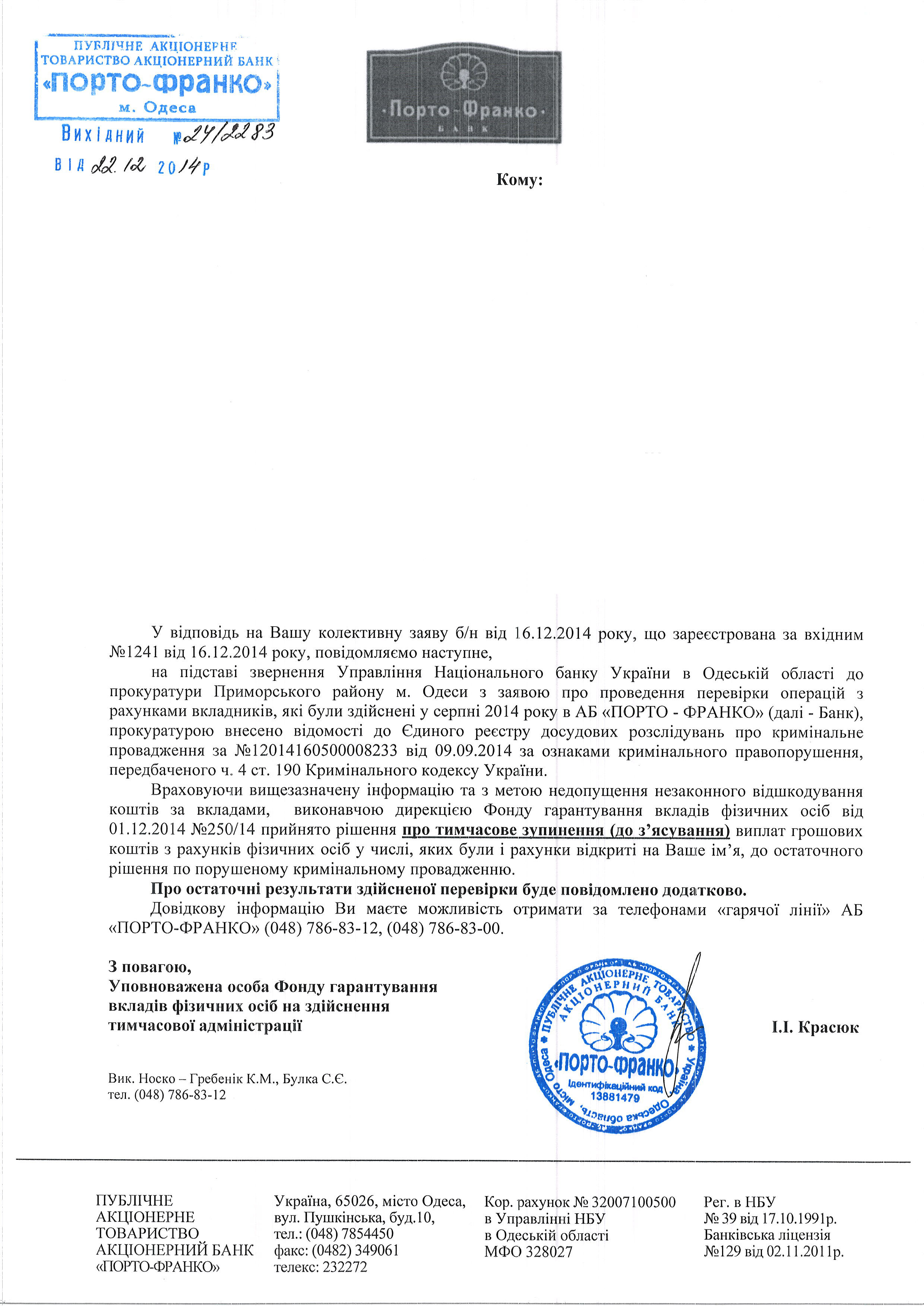 Вчера – 23.12.2014 года – прошла встреча представителей инициативной группы клиентов ПАТ АБ “Порто-Франко” с заместителем прокурора Одесской области – Закерничным Павлом Ивановичем. В ходе встречи было подтверждено, что уголовное производство находится в прокуратуре области, назначен следователь – Макарченко Дмитрий Сергеевич. Достигнута договорённость о том, что со следователем будет проведена встреча для согласования совместных действий, направленных на скорейшее завершение следствия по данному делу. Со слов заместителя прокурора, количество клиентов банка в списке выемки не 95, а 92 – несколько фамилий повторяются.