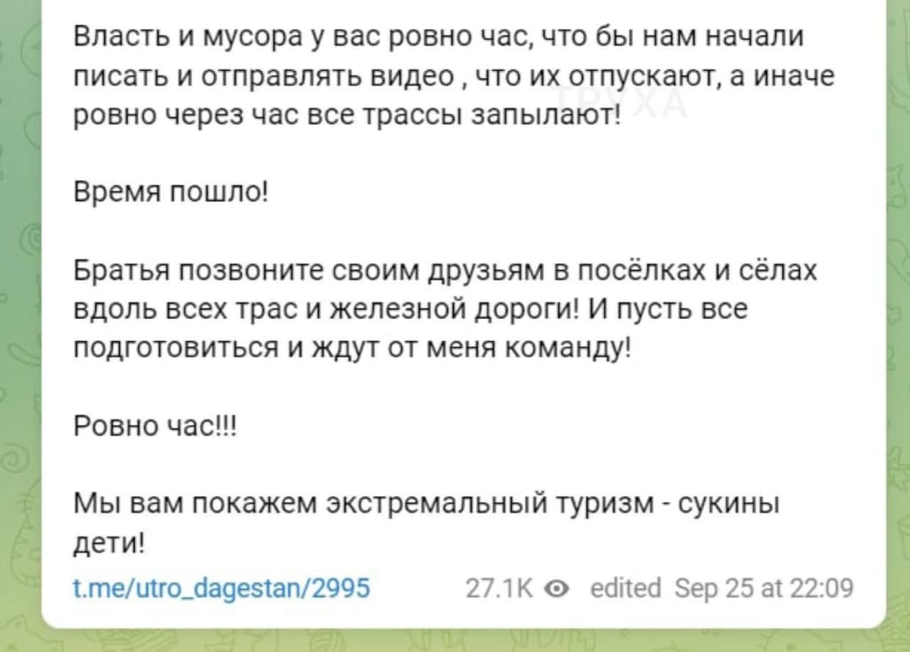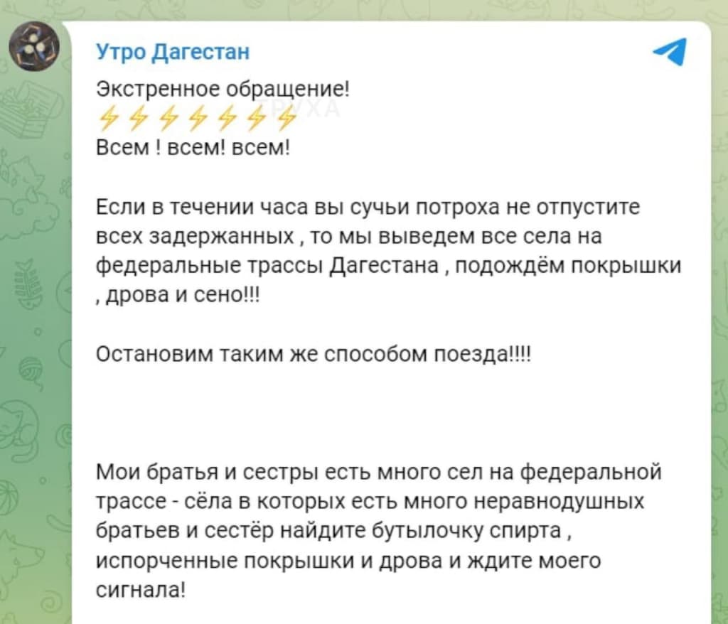 Так или иначе, протесты в Дагестане набирают обороты, развиваясь по украинскому сценарию (Майдан). Так, в Дагестанских пабликах, властям поставлен ультиматум – немедленно освободить всех задержанных.