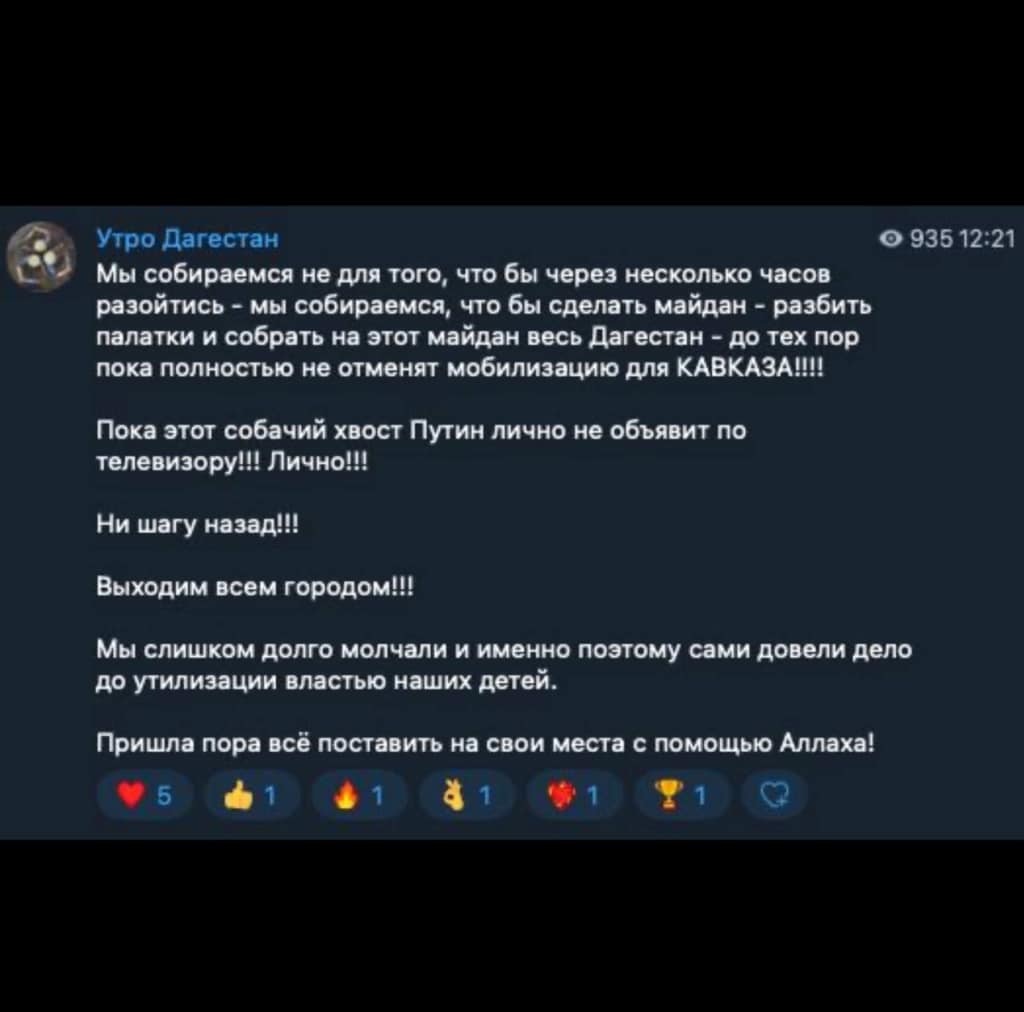 Наибольшего успеха удалось добиться жителям Дагестана, которые свой протест превратили в бунт, объяснив физически правоохранителям, что такое демократия. Видео с мероприятий в Дагестане облетели весь мир. На них даже 26.09.2022 года отреагировал Президент Зеленский.
