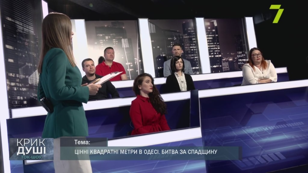 Ведуча: Вітаю. З вами ток-шоу «Крик душі». Мене звати Світлана Пензова. Тема цього випуску: «Цінні квадратні метри в Одесі. Битва за спадщину». До нашої студії завітали такі гості: одеситка Тетяна Рибалко, адвокат Тетяни Оксана Баранова, приватний нотаріус Микола Журавель, адвокат Святослав Чумаченко, юрист Андрій Степаненко, а також Олена Іонова, авторка проекту «Крик душі». Вітаю. Добрий вечір. Отже, цінна спадщина. Три роки точаться суди за будинок в Одесі. До нас звернулася одеситка Катерина Логвінова. На початку дивимося сюжет.
