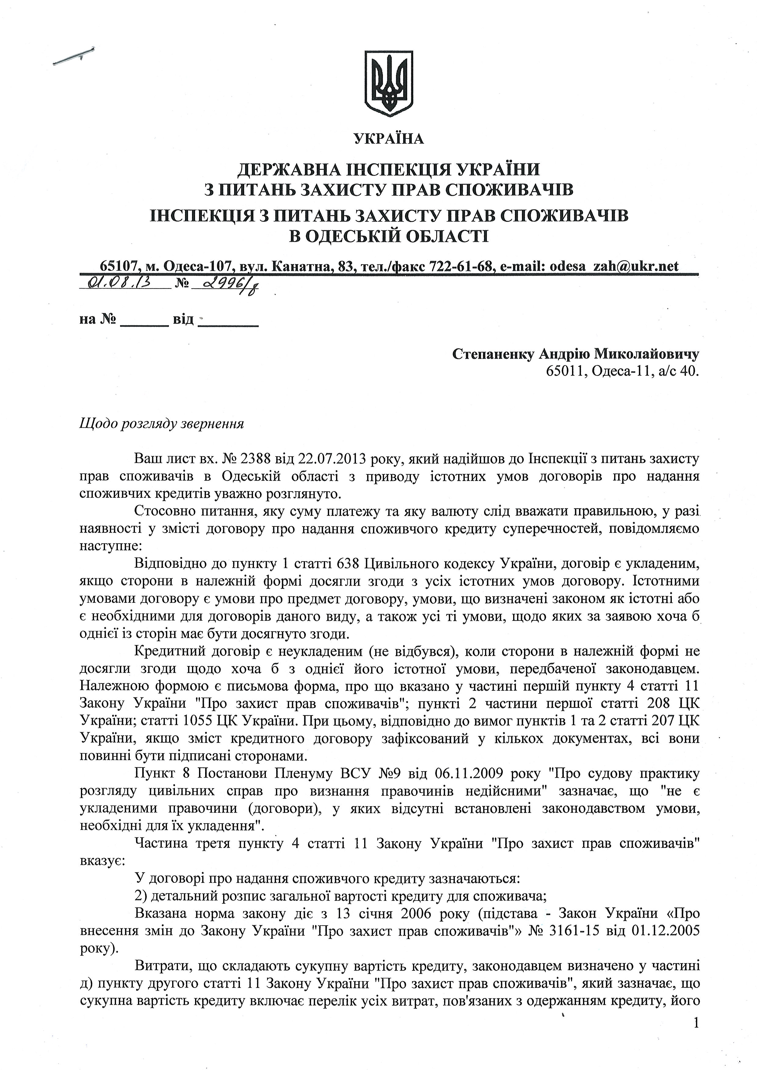 Письмо Инспекции по вопросам защиты прав потребителей касательно противоречий в валюте погашения кредита (стр. 1)