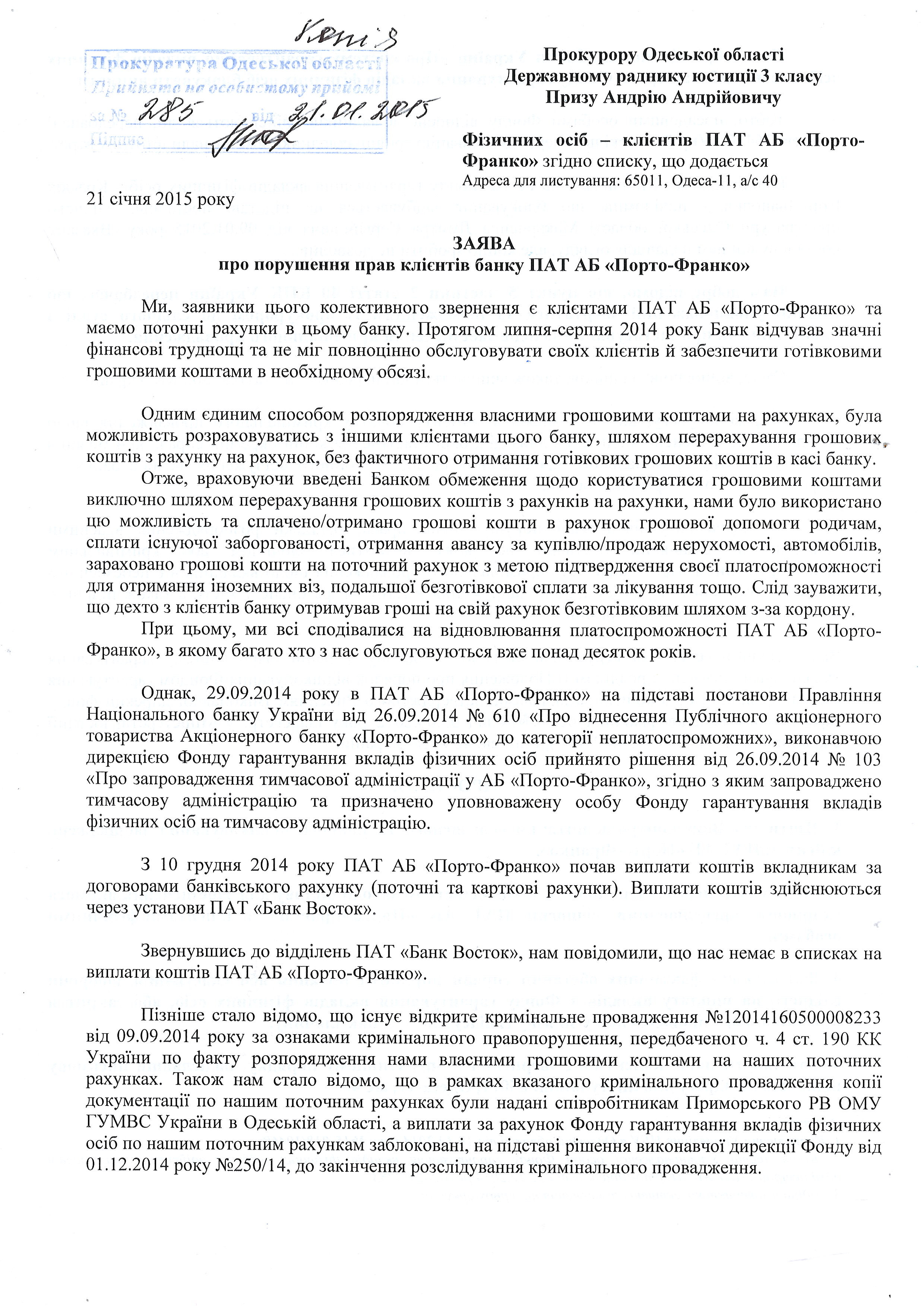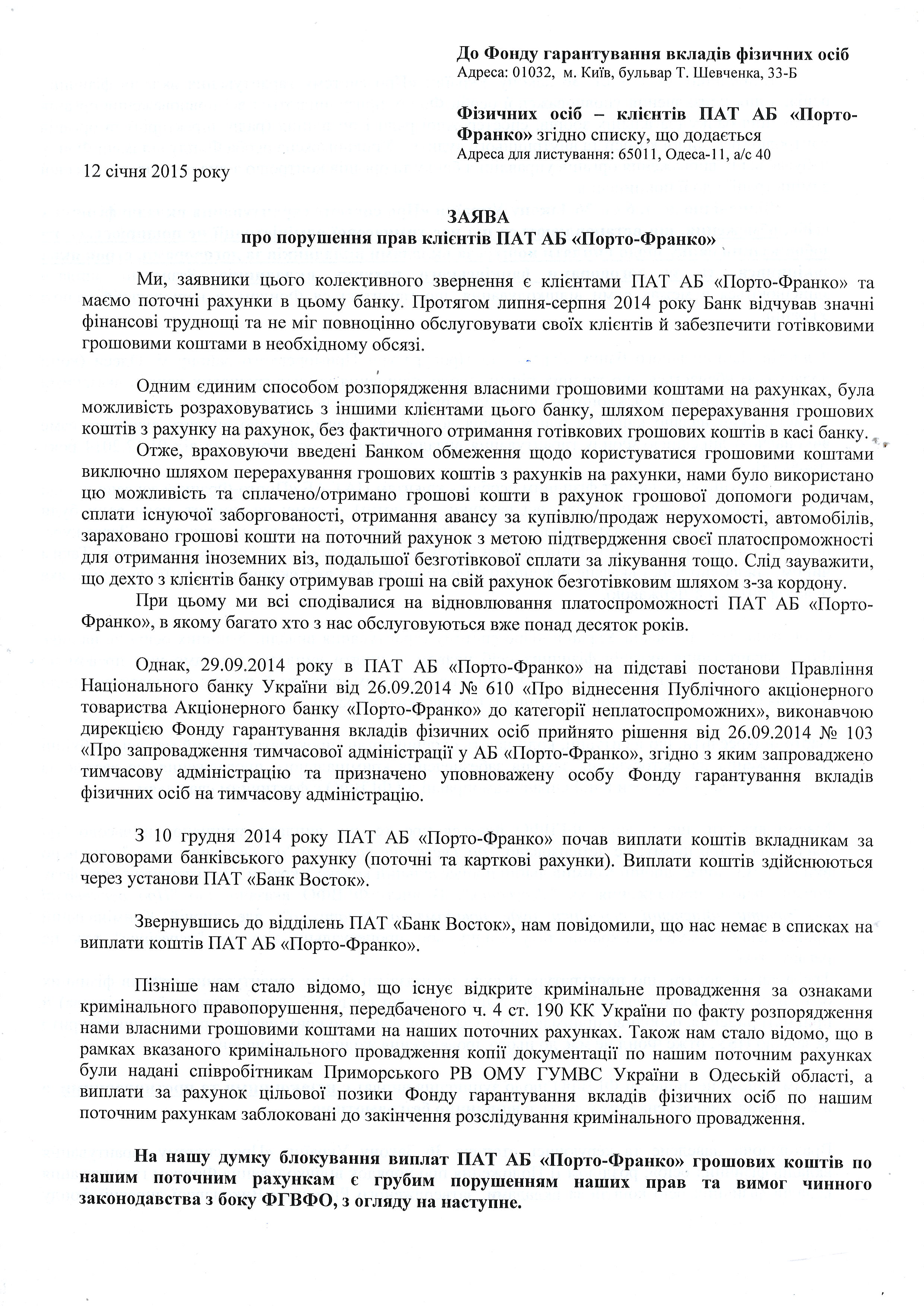 Как вы уже поняли, содержательность данного ответа сравнима с информативностью пустого листа бумаги. Но ответ был дан лишь 17 января 2015 года, а до этого момента была масса обращений к прокуратуре и следователю с целью заставить их исполнять свои должностные обязанности. Сначала, была договорённость встретиться 29 декабря 2014 года, но этой встрече помешала стихия – Одессу засыпало снегом, затем праздники, но уже 12 января 2015 года, я вновь созвонился со следователем, который заверил меня, что с 19.01.2015 года он начинает интенсивный опрос вкладчиков. Параллельно, я отправил в Фонд гарантирования вкладов физических лиц (в г. Киев) петицию следующего содержания: