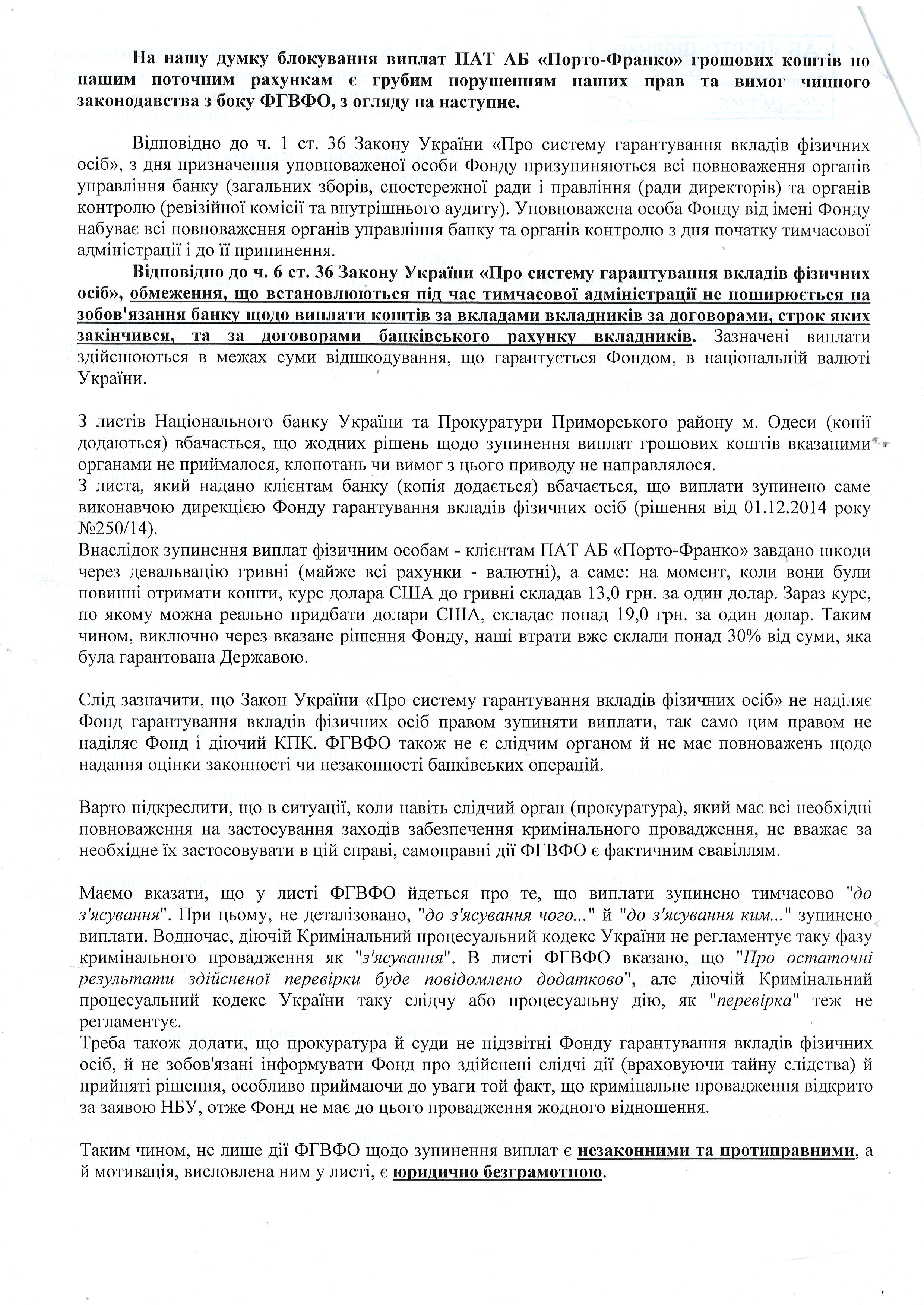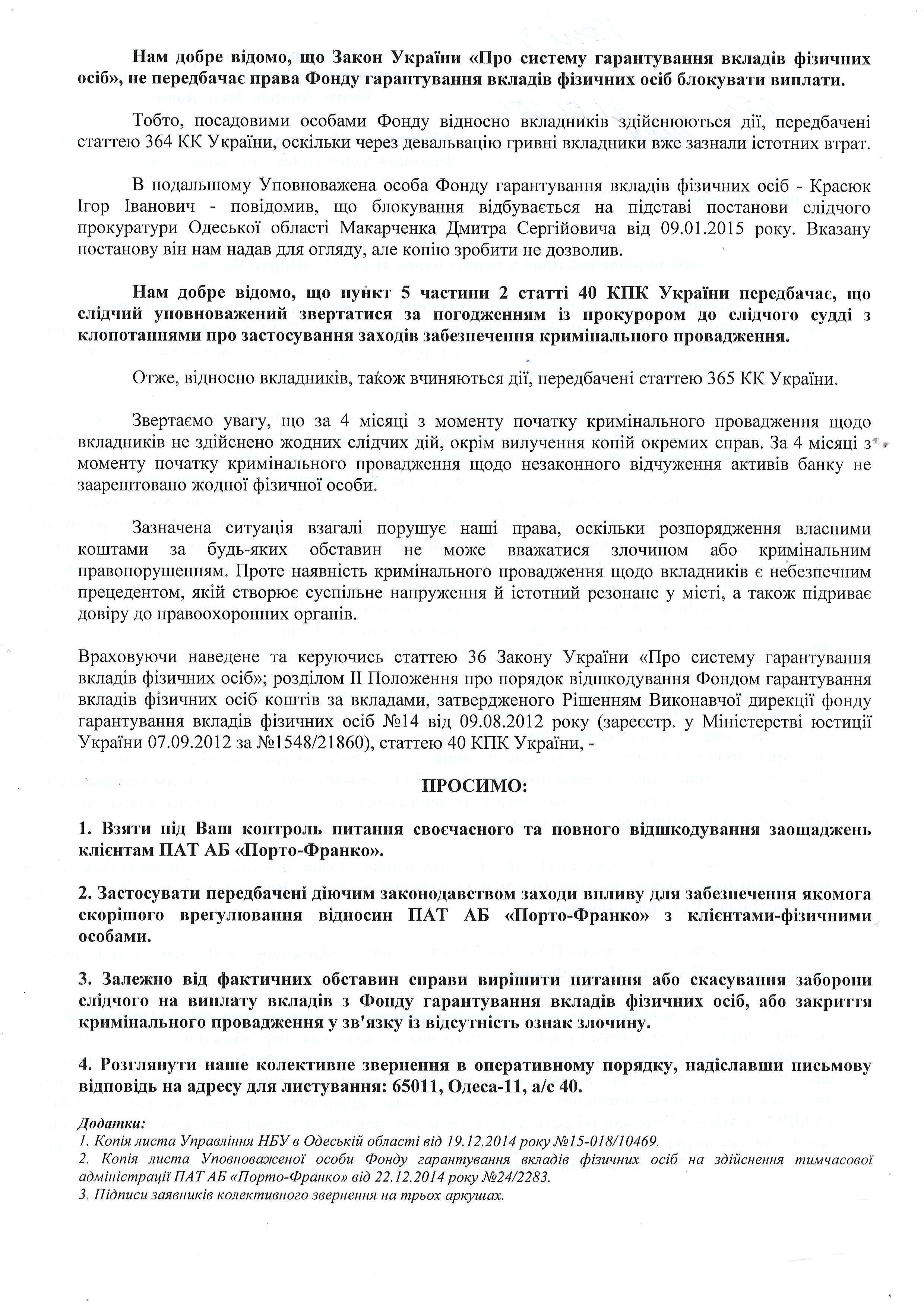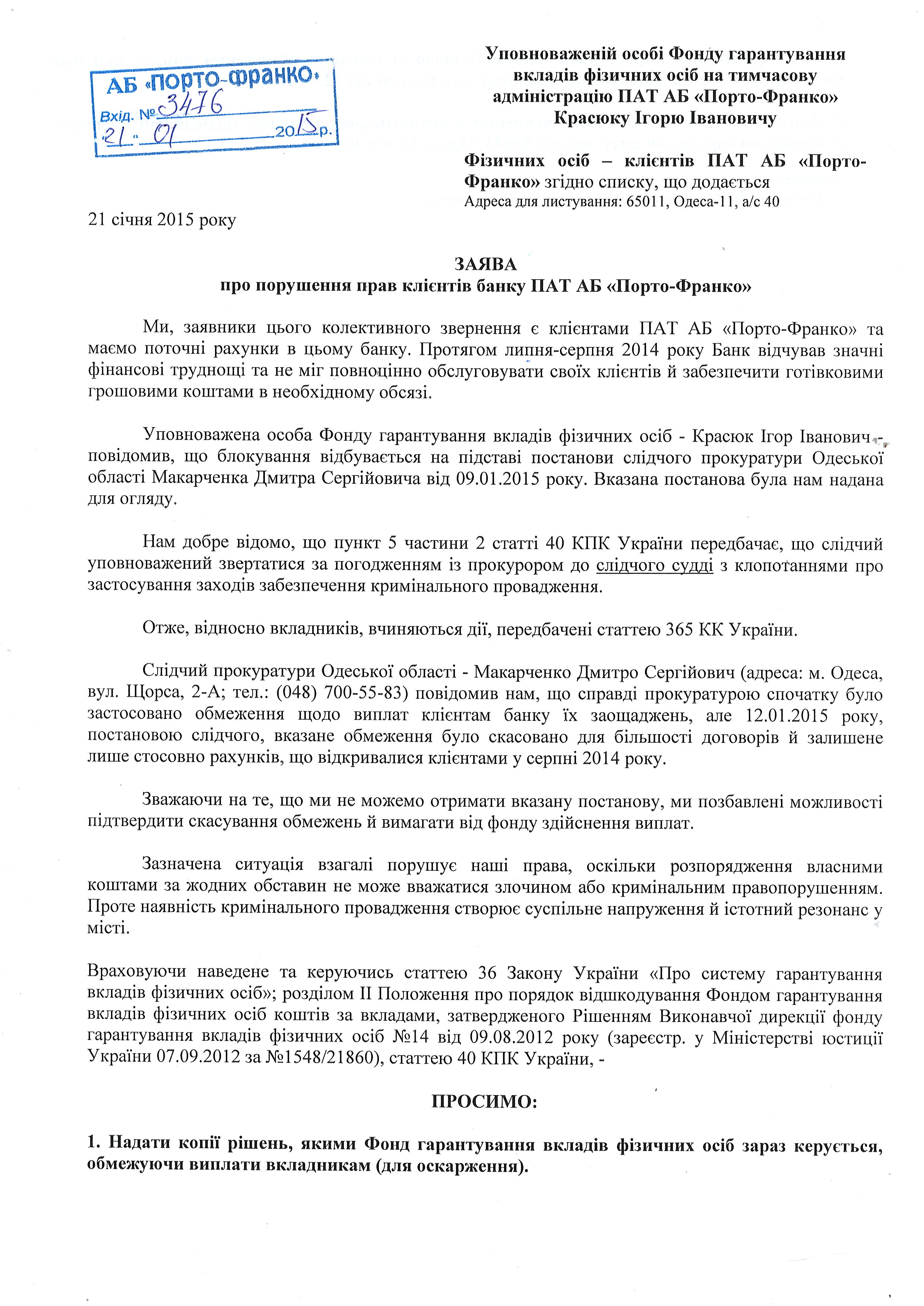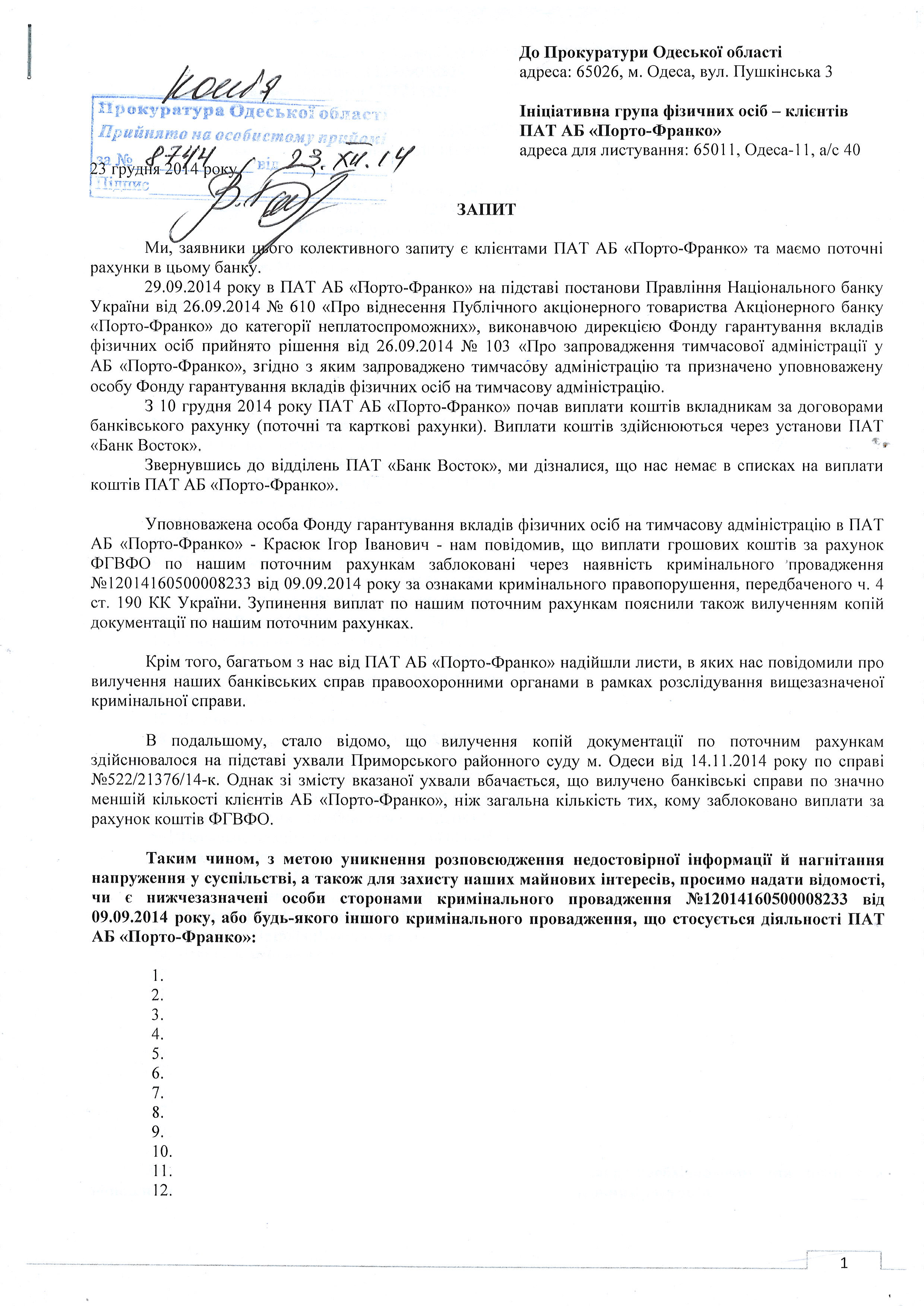 Обоим группам клиентов банка уполномоченное лицо ФГВФЛ – Красюк И.И. – присылал письма, что в связи с открытым уголовным производством, выплаты приостановлены (временно, “до выяснения”). Таким образом, в первую очередь нужно было выяснить, действительно ли клиенты, чьи дела не изъяты, являются стороной уголовного производства. Для этого, с 15 по 21 декабря 2014 года нами создавались списки тех людей, чьи счета были заблокированы, но в определении суда о выемке они не значились, а 23 декабря 2014 года в областную прокуратуру был подан запрос с просьбой подтвердить или опровергнуть информацию о том, что данные лица являются сторонами по уголовному производству. Текст этого запроса (за исключением фамилий) приведён ниже: