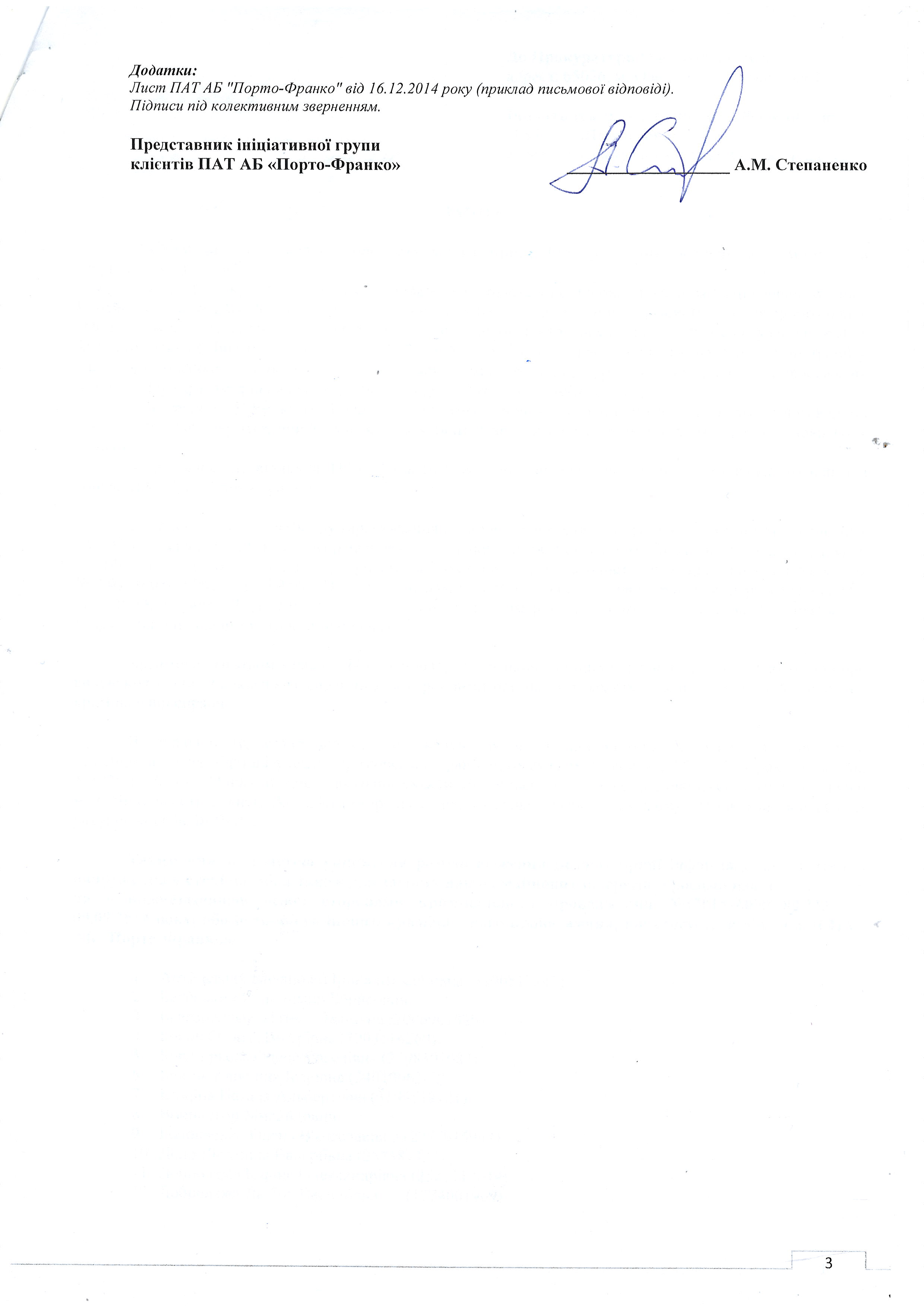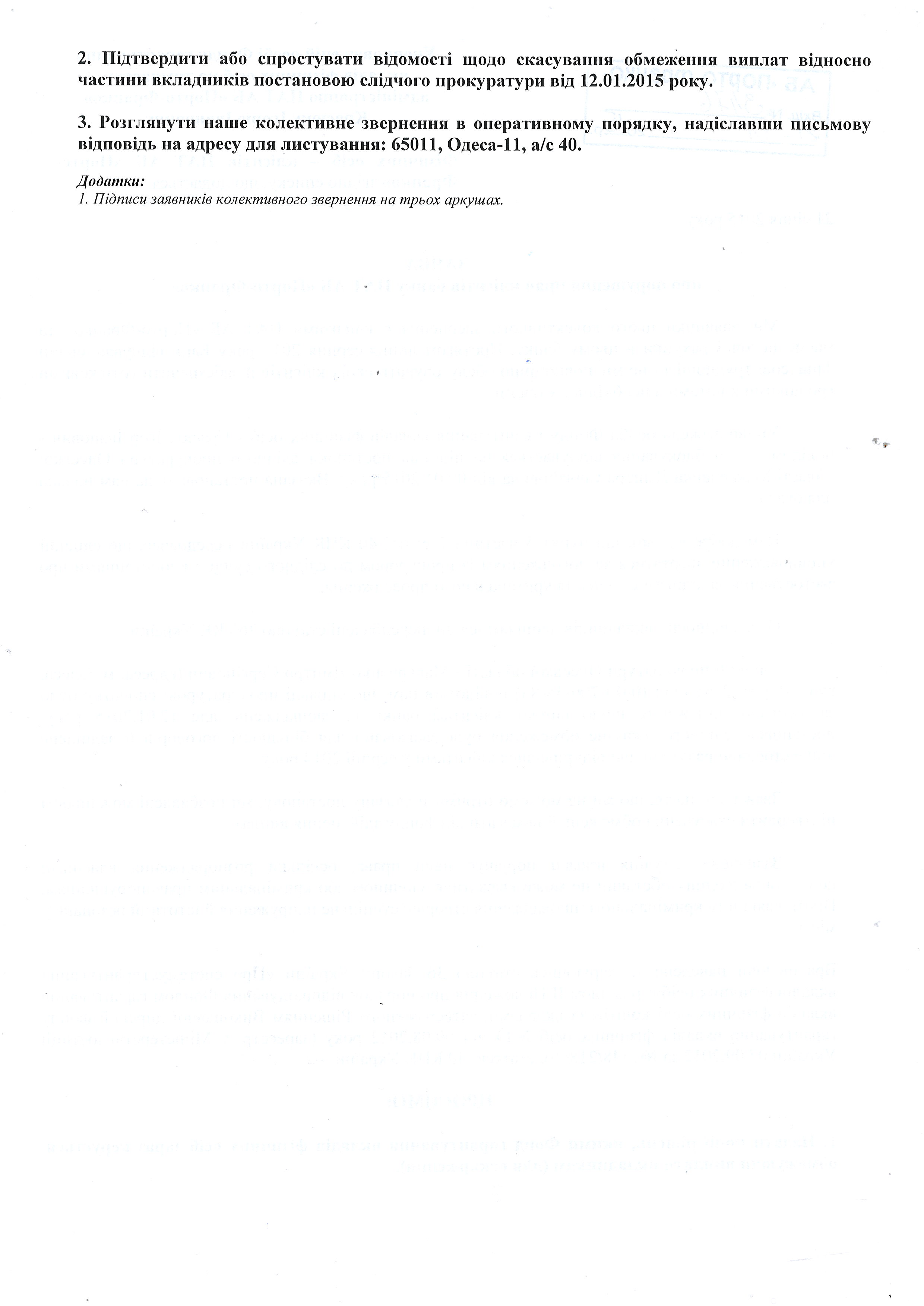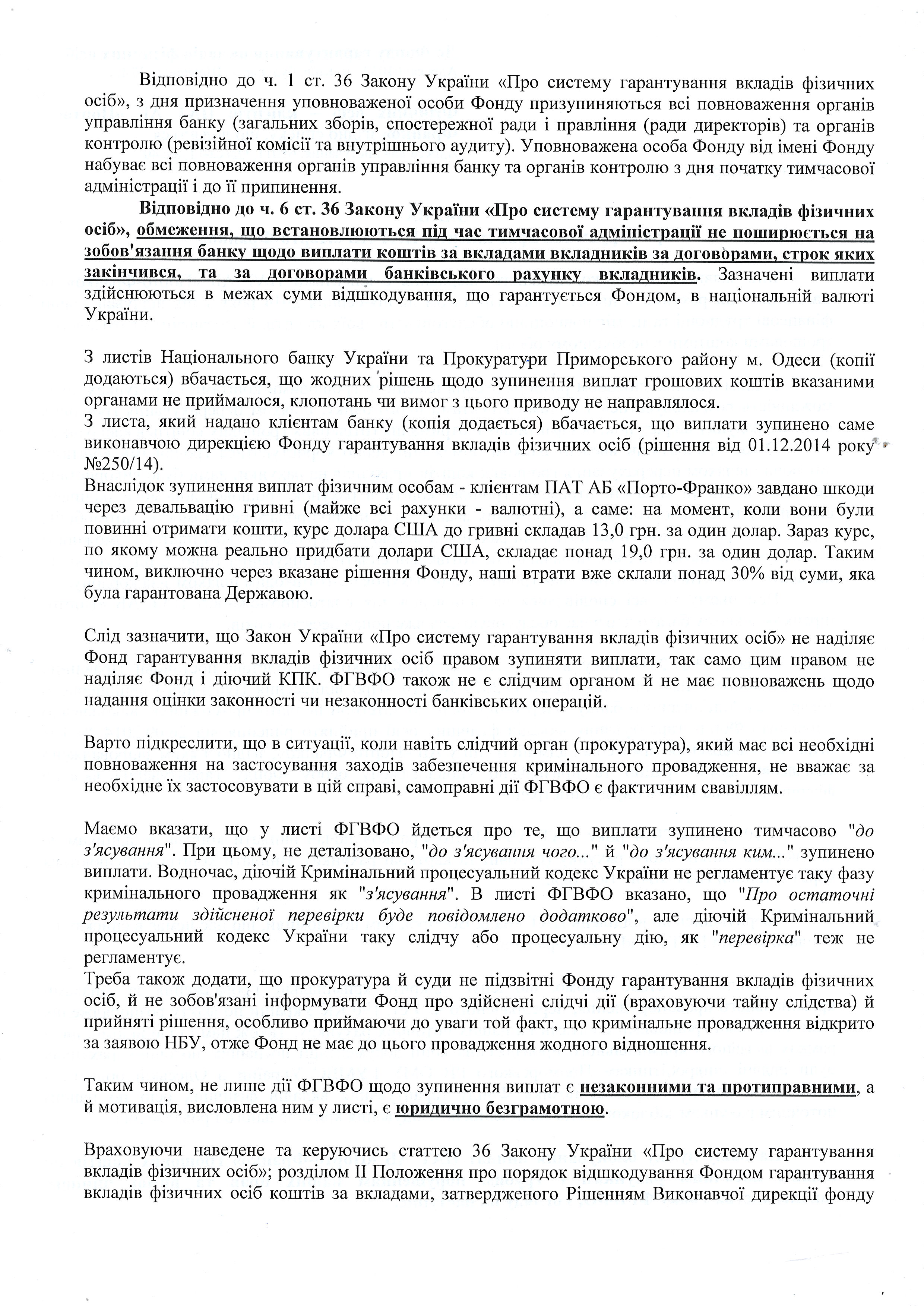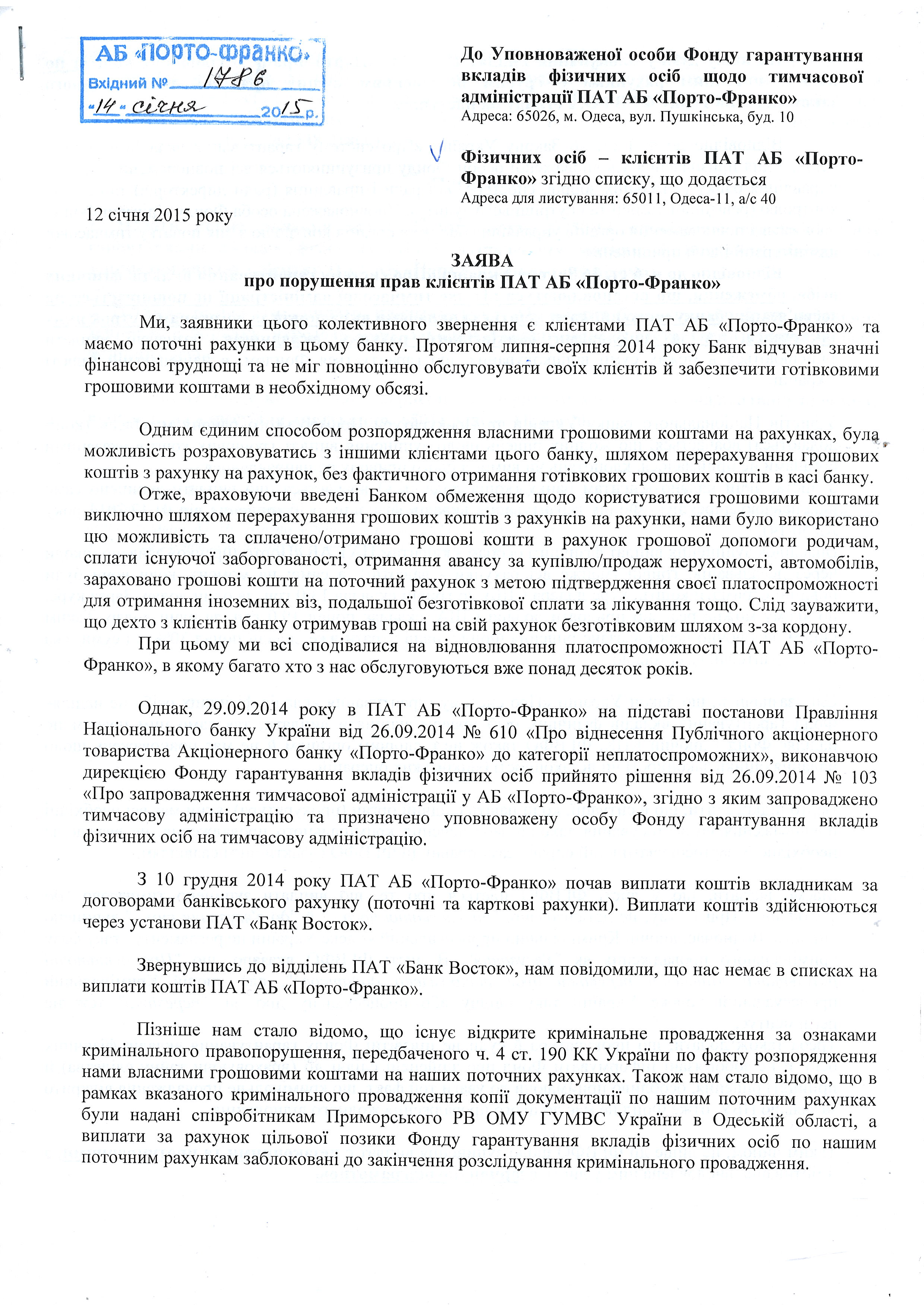 Обоим группам клиентов банка уполномоченное лицо ФГВФЛ – Красюк И.И. – присылал письма, что в связи с открытым уголовным производством, выплаты приостановлены (временно, “до выяснения”). Таким образом, в первую очередь нужно было выяснить, действительно ли клиенты, чьи дела не изъяты, являются стороной уголовного производства. Для этого, с 15 по 21 декабря 2014 года нами создавались списки тех людей, чьи счета были заблокированы, но в определении суда о выемке они не значились, а 23 декабря 2014 года в областную прокуратуру был подан запрос с просьбой подтвердить или опровергнуть информацию о том, что данные лица являются сторонами по уголовному производству. Текст этого запроса (за исключением фамилий) приведён ниже: