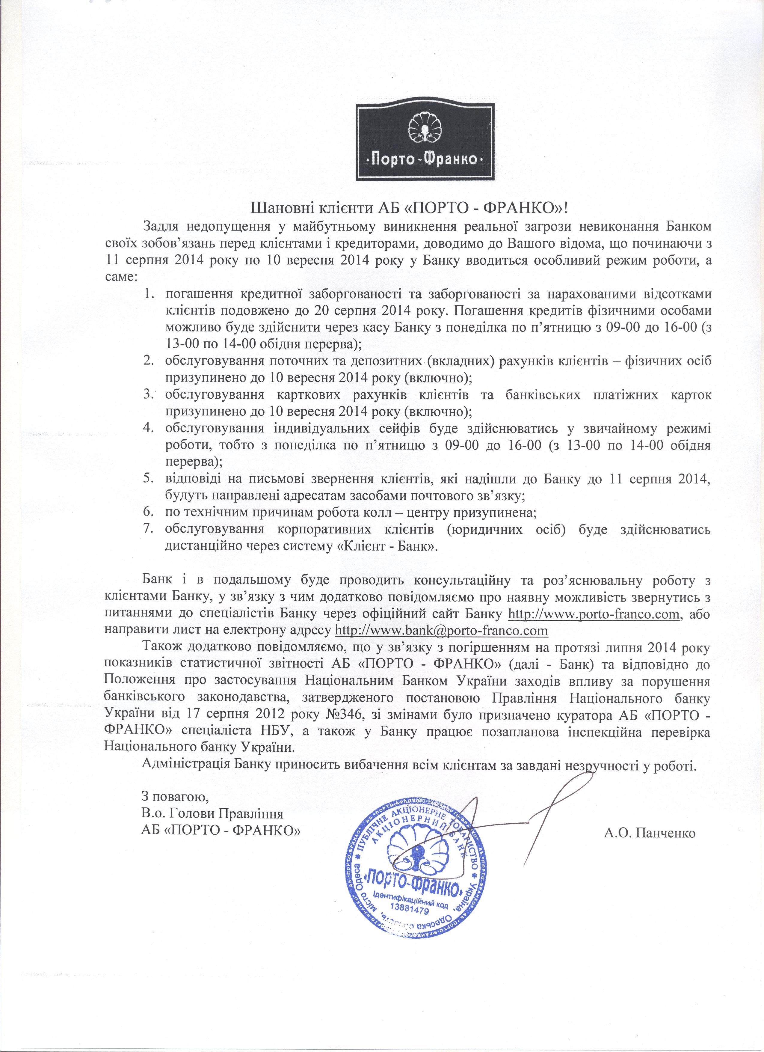 Кроме того, на официальном сайте КБ «ПОРТО ФРАНКО» опубликовано объявление о приостановлении работы всех отделений банка. Обслуживание всех депозитных и текущих счетов приостановлено. Всем клиентам КБ «ПОРТО ФРАНКО» было разослано письмо следующего содержания.